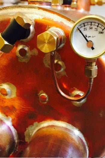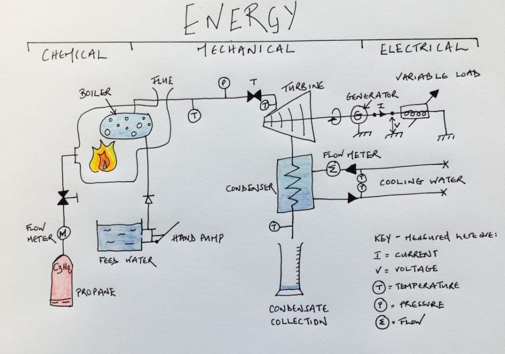 Providing a visual demonstration of the Rankine Cycle, the burners combust the propane within the copper boiler. This heats the water to produce steam at pressure. As Simon opens the throttling valve, it releases the steam from the boiler into the turbine. The steams potential energy is therefore converted into kinetic energy, as we can see the electrical generator turning.
